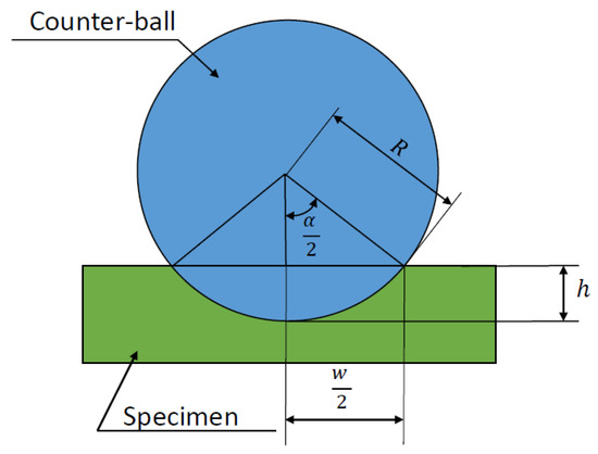 where is the diameter of the wear mark on the counterface parallel to the wear direction [mm], denotes the diameter of the wear mark on the counterface perpendicular to the abrasion direction [mm], R is the radius of the counter-ball before measurement [mm], is the average radius of the counter-flange after the abrasion test [mm]. The average radius after the abrasion test can be determined as a function of