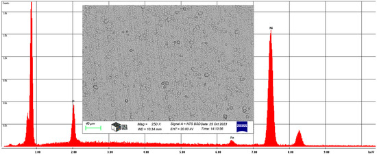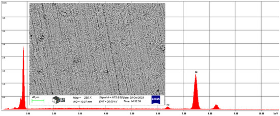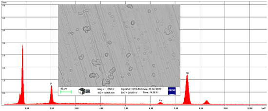 The chemical composition was measured by SEM. For the Ni-P-I coating, the average chemical composition of the coating area of 145,250 was analyzed at 250× magnification, as illustrated in Figure 5. On average, the coating contains 6.66 w% phosphorus, 1.92 w% iron, and 91.42 w% nickel, with the same elements having a phosphorus content of 11.89 at%, an iron content of 1.91 at%, and a nickel content of 86.2 at%.
