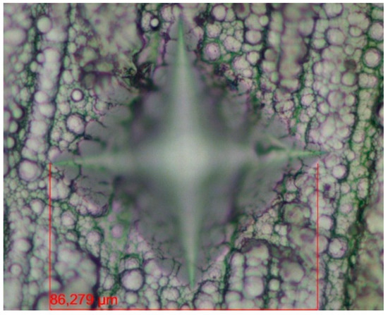 Figure 8 shows a microscopic image of the Ni-P-I specimen’s Vickers pyramid indentation. The measured microhardness values are also summarized in Table 4.