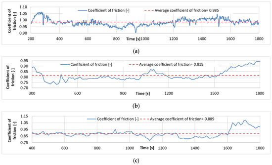 Examples of the time friction coefficient diagrams for the wear tests carried out for each coating are shown in Figure 9, while the measurement results are summarized in Table 5.