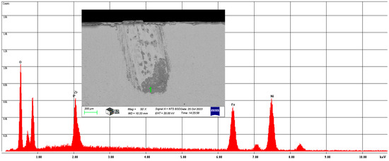 In the case of the Ni-P-I coating, the next analysis was performed on the 50× magnification image of the wear track to analyze the chemical composition of area 1, illustrated in Figure 10.