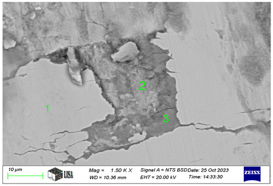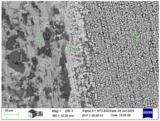 For the Ni-B coating, the chemical composition in the wear track, at the transition between the wear track and the intact coating and on the intact coating, was next measured on the image of the wear track at 250× magnification. The results of the measurements are shown in Table 8, and the 250× magnification image of the worn track is shown in Figure 13. The figure is labelled as follows: 1 = intact coating, 2 = wear track surroundings with slight coating abrasion, 3 = wear track.
