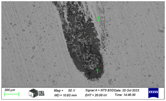 For the Ni-P-II coating, the chemical composition at the end and at the edge of the wear track was next measured on a 50× magnification image of the wear track (see Figure 12). The measurement results are summarized in Table 7.