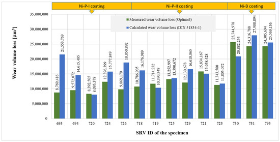 Based on the calculation of Archard’s and Liu’s wear coefficients, it can be concluded that the two wear coefficients are very similar, with a multiplier of 2–3; the highest wear coefficient has been detected for both calculation methods for Ni-B. Note that for all coatings, the Archard’s wear coefficient was higher than Liu’s.