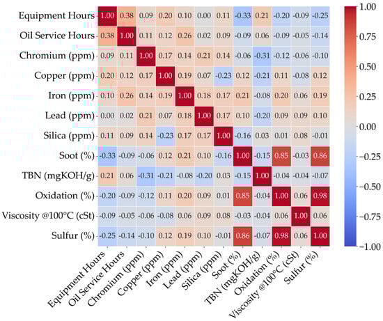 Correlation analysis, including Pearson’s coefficients, highlighted significant interactions among lubricant parameters. Strong relationships, notably between oxidation, sulfur, and soot, corroborate prior findings on combustion-induced lubricant degradation phenomena, underscoring their potential as key diagnostic indicators.