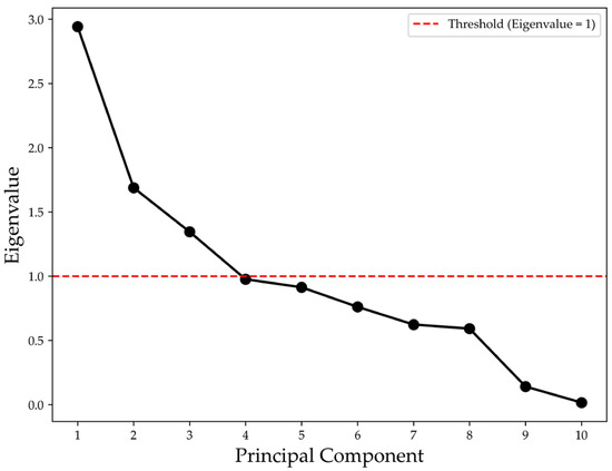 The corresponding scree plot in Figure 3 illustrates the contribution of each principal component to the total variance and supports the decision to retain the first four components for interpretation.