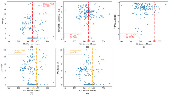 It is essential to clarify that the change points identified in this study do not correspond to actual oil drain events but rather to statistically significant transitions in the operational behavior of each lubricant parameter. Since these parameters reflect distinct physicochemical degradation mechanisms, the timing of such transitions naturally varies.