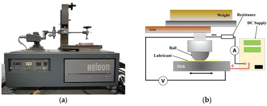 The test conditions were as follows: applied load, 5 N; reciprocating sliding speed, 8.0 mm/s; stroke length, 4 mm; and test duration, 1 h. These parameters were selected to mimic severe boundary lubrication conditions in EV drivetrain contacts, ensuring observable wear and tribofilm formation within a one-hour test. All tests were conducted at room temperature (23 ± 2 °C), 45–55% relative humidity, and repeated three times. During testing, a DC stabilized power supply provided the electrical current (with applied current levels varying from −80 mA to +80 mA in different tests), and measures were taken to electrically isolate the test rig. A polyimide insulating film was placed under the specimen holder base to prevent current from flowing to any part of the apparatus other than the sample specimens. Additionally, the shaft holding the ball was wrapped with an insulating film to ensure the ball was electrically isolated from the rest of the machine.