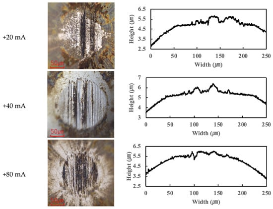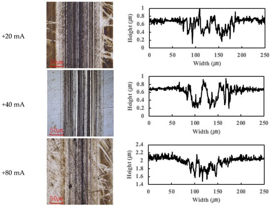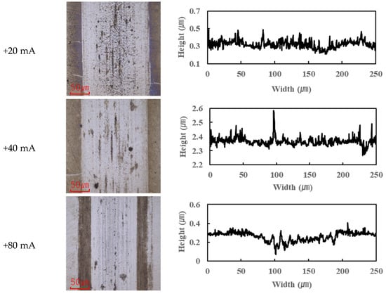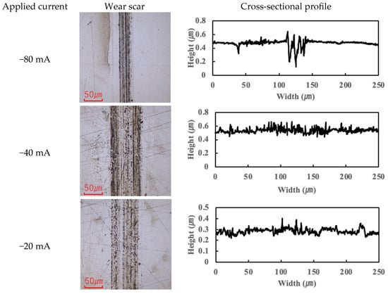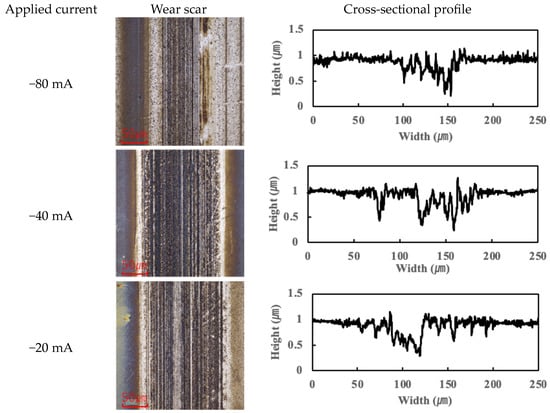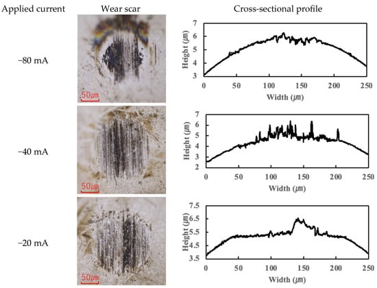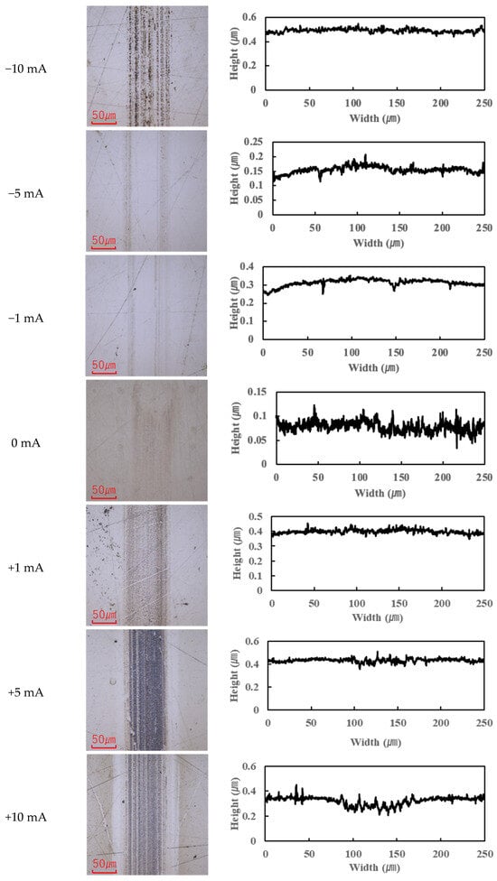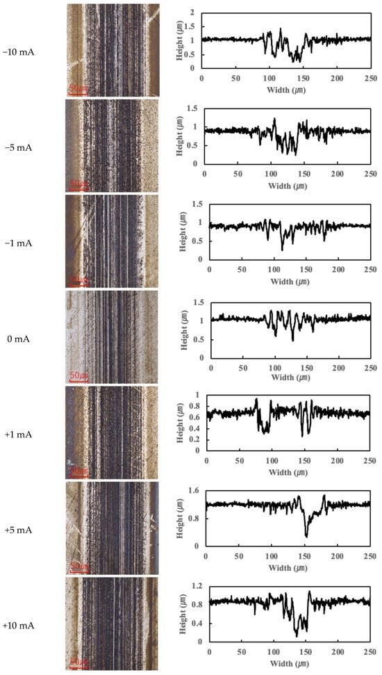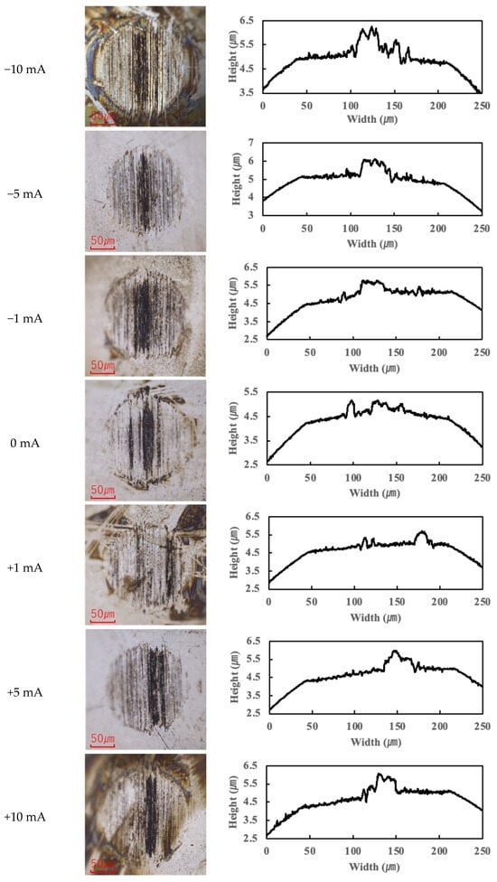 Previous studies have suggested that PPE molecules can form polymeric tribofilms during friction, which helps to reduce friction [25]. The findings of this study support this hypothesis: under moderate current conditions, a thin tribofilm derived from PPE forms on the contact surfaces, which contributes to lubrication and helps maintain a low friction coefficient. However, once the applied current exceeded roughly 10 mA, the excessive formation and accumulation of tribofilm began to adversely affect friction, causing the COF to rise beyond the baseline. (This aspect is further discussed in Section 3.3.)