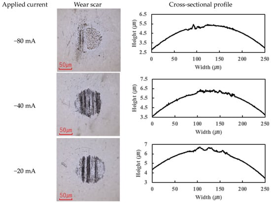 As shown in Figure 3, the effect of current direction and magnitude on the average COF was evaluated. The COF values reported are steady-state values, obtained by averaging the data from the last 10 min of each test (after the running-in period). In all cases, the sign of the applied current is defined from the perspective of the ball (i.e., a “+” current means the ball is the positive electrode).