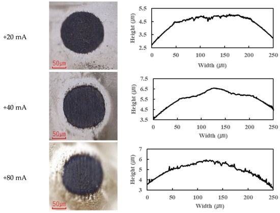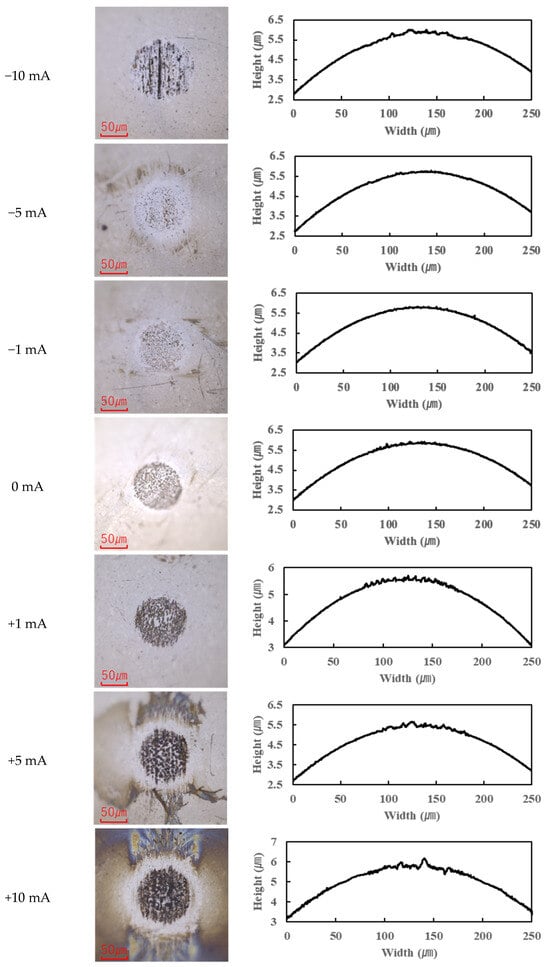 The application of current also affected wear. Figure 4, Figure 5, Figure 6 and Figure 7 present the wear scars and surface profiles of the ball and disk under different current conditions. The PAO tests showed almost no change in wear scar appearance across the range of currents. The wear scars with PAO lubrication remained bright and metallic in appearance, with only the minor localized attachment of wear debris. As seen in Figure 4 and Figure 5 (PAO and ball and disk, respectively), varying the current direction or magnitude did not produce any significant difference in scar color or condition, and no distinct tribofilm layer was evident (apart from a small amount of scattered debris).
