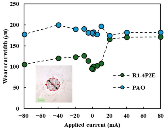 Under all the tested current conditions, the PPE-based lubricant (R1-4P2E) exhibited a lower COF than the PAO. This trend is consistent with previous findings [25] reporting that PPE-based lubricants significantly reduce friction compared to PAO. Within the current range of approximately −10 mA to +10 mA, R1-4P2E maintained a COF of about 0.06–0.07, which was 30–40% lower than that of the PAO (~0.10). However, for current values exceeding 10 mA, a notable increase in COF was observed for R1-4P2E. For example, at +20 mA the COF increased by approximately 10% relative to the 0 mA (non-electrified) condition, and at +80 mA it increased by roughly 25%. Furthermore, the rise in COF was more pronounced when the ball was the positive electrode. At +20 mA, the COF with the ball being positive was higher than the COF with the ball being negative, suggesting that current polarity has a significant influence on friction behavior.