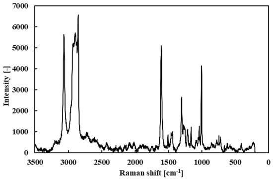 First, the Raman spectrum of the fresh R1-4P2E lubricant (liquid) was measured as a baseline (Figure 9). The spectrum showed prominent peaks near 3000 cm−1 (attributed to C–H stretching vibrations of alkyl groups), around 1600 cm−1 (C=C stretching vibrations from the aromatic rings), and near 1000 cm−1 (C–H bending vibrations). These peaks confirm the presence of vibrational modes characteristic of PPE’s molecular structure.