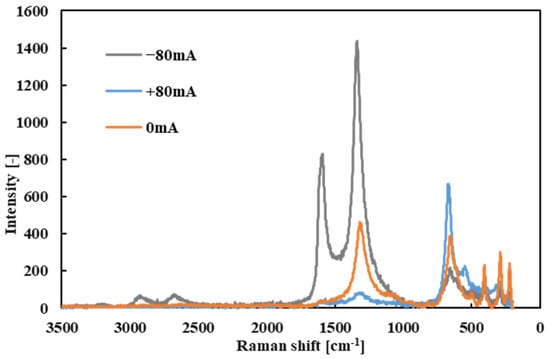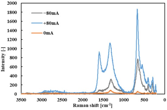 Under certain conditions, an additional peak appeared near 1590 cm−1 in the tribofilm spectrum. This peak corresponds to the G-band, indicative of graphitic carbon structures [25,35]. Notably, the G-band was most evident in tribofilms formed when the electrode was positive on that specimen (for example, the ball at +80 mA vs. disk at −80 mA scenario). The appearance of the G-band implies that, under those high-current conditions, the tribofilm contained a degree of graphitized carbon in addition to amorphous carbon.