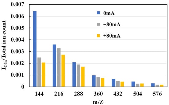 The ToF-SIMS spectra confirmed the presence of IC6n fragments in the tribofilm, indicating the formation of graphite-like (graphitic) structures within the film. Importantly, these graphitic carbon fragments were detected in the tribofilm regardless of whether a current was applied. In both the non-electrified and ±80 mA conditions, IC6n species appeared, suggesting that some degree of carbon clustering/graphitization occurred from the PPE decomposition even in purely mechanical rubbing. This finding aligns with the Raman results, where the ~1590 cm−1 G-band of graphitic carbon was observed, reinforcing that graphitic structures are indeed present in the tribofilm.