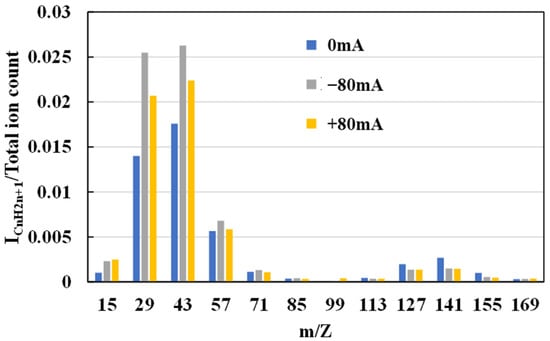 On the other hand, the hydrocarbon-related fragments (ICnH2n+1) showed a noticeable increase in intensity in the lower-molecular-weight range under electrified conditions. This implies that an electrified environment enhances the breakdown of hydrocarbon chains in the lubricant, producing more low-mass hydrocarbon fragments. In practical terms, the electric current seems to promote the further decomposition of the lubricant’s alkyl side chains.