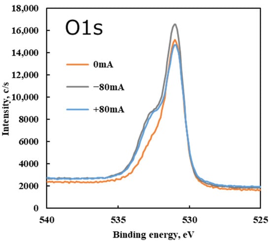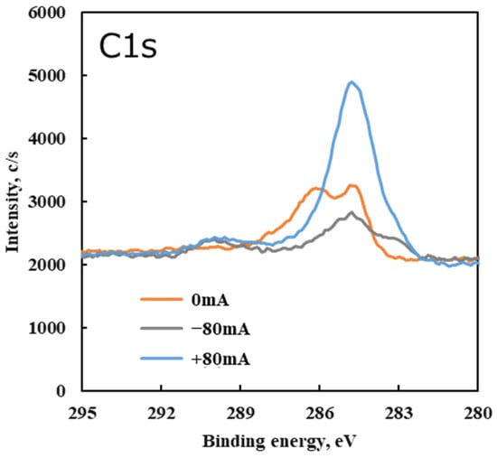 In the C 1s spectrum, a primary peak was observed at approximately 284.5 eV under all conditions. This peak corresponds to carbon in C–C bonds, which is attributed to the hydrocarbon backbone of the lubricant and carbonaceous tribofilm. Under the non-electrified condition (0 mA), an additional C 1s peak appeared near 286 eV. The 286 eV component is associated with C–O bonds (ethers/alcohols). This indicates that some PPE lubricant residue (likely intact or partially decomposed molecules with ether linkages) remained adsorbed on the surface after the test without current. In other words, without an electrical current, a small amount of lubricant decomposition occurred due to friction, leaving behind species with C–O (ether) groups on the steel surface.