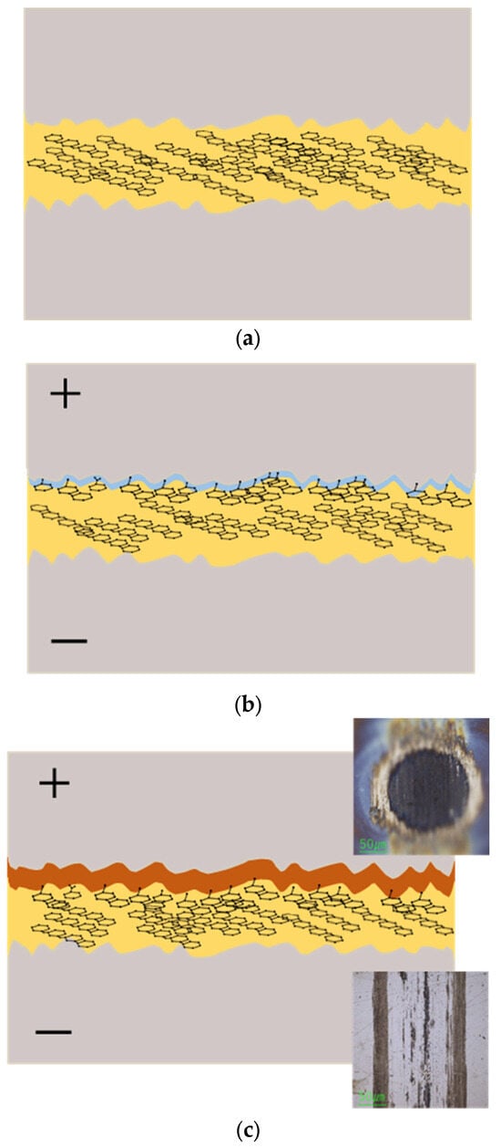 Through this process, a continuous supply of decomposition products (both carbonaceous fragments from the lubricant and iron oxide wear debris from the steel) is generated by ongoing friction. Simultaneously, the electric field drives these products onto the positive electrode surface and helps them adhere there. The tribofilm thus begins to form on the positive side. Initially, this tribofilm may be an ultrathin layer. As the test continues (and as long as current flows and friction generates more debris), the carbonaceous material and oxides accumulate, and the tribofilm grows progressively thicker (Figure 16b,c). In our experiments, after approximately 1 h of testing at +80 mA, a visibly thick tribofilm had developed on the positive (ball) surface.
