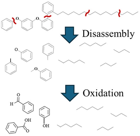 Based on the above results, we propose a mechanism for tribofilm formation in PPE-lubricated systems, illustrated schematically in Figure 16. Under non-electrified conditions, PPE molecules have a plate-like structure that allows them to adsorb parallel to the steel surface, forming a protective film that reduces friction (Figure 16a). This adsorption and alignment help minimize direct metal-to-metal contact. However, when friction generates nascent metal surfaces or significantly raises the local temperature, PPE molecules become more susceptible to decomposition (Figure 17). The breaking of molecular bonds (particularly the ether linkages) can occur due to the high surface energy of freshly exposed metal and the heat of friction.