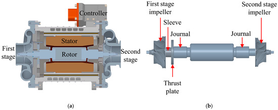 The structure of the HFCVAC used to build the test rig is shown in Figure 2. The test rig in this paper is modified by a commercial HFCVAC, which is designed to supply air to a hydrogen fuel cell bus. The compressor is driven by a permanent magnet synchronous motor with a rated power of 30 kW and a rated speed of 90 kRPM. The middle part of the rotor of the compressor has a built-in permanent magnet, and the rotor is fitted with a first-stage impeller, a second-stage impeller, a thrust disk, and a sleeve, which are fixed to the shaft by nuts at both ends of the shaft. The rotor Is supported radially by a pair of two-pad journal GFBs and axially by a pair of thrust GFBs to ensure its completely oil-free character.