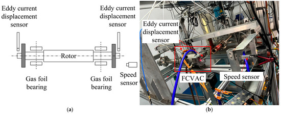 Figure 3 shows the schematic diagram and photo of the unbalance response test rig of HFCVAC. The rig is equipped with two eddy current displacement sensors to measure vertical displacement at both ends of the rotor. These sensors are fixed to the housing of the HFCVAC to minimize the influence of base vibrations. A photoelectric speed sensor is used to determine the phase of the displacement. The test impeller is marked with a black indicator, and the photoelectric speed sensor generates a low-level signal when the rotor reaches a specific angle of the mark.