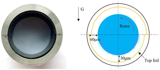 Figure 5 shows the two-pad GFB used in the experiments. This design consists of two bump foils and two top foils, which reduces the number of foils, thus lowering the fabrication and processing costs while retaining the advantages of the three-pad GFB with multiple gas films. Previous experiments have demonstrated that the two-pad GFB exhibits good load-carrying capacity and stability [18].