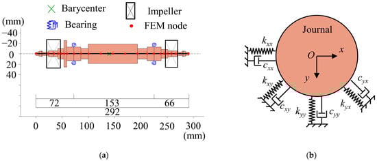 Figure 6. Model of GFB-rotor system: (a) rotor FEM model; (b) GFB dynamic coefficient model.