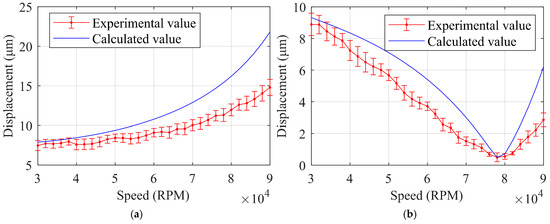 Figure 8 shows the experimentally measured displacements of the rotor with 79 mg of unbalanced mass added to the first-stage test impeller, alongside the model-predicted results. The trend predicted by the model aligns well with the experimental results, though the predicted displacements are slightly larger. At 30,000 RPM, the error between the model calculation results and the experimental data is less than 5%. This discrepancy arises because the model uses the dynamic coefficients of the bearing when the rotor is in an equilibrium position. As the rotor’s displacement increases, the gas film between the rotor and the bearing becomes thinner, which in turn increases the stiffness provided by the gas film. As a result, the rotor’s displacement decreases compared to the original calculation based on gas film stiffness.