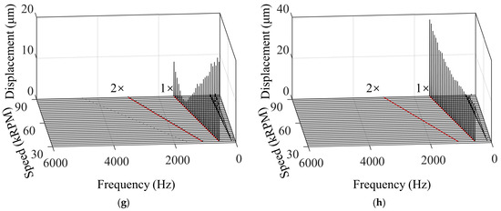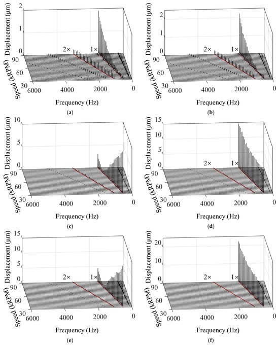 The collected signals were subjected to Fast Fourier Transform and the resulting waterfalls are shown in Figure 9. The primary displacement component was found at 1× RPM, which corresponds to the synchronous vibration caused by the unbalanced mass. A secondary component appeared at 2× RPM, likely due to slight misalignment of the rotor. The subsynchronous vibrations in the low-frequency range were minimal, indicating that the GFBs exhibited good stability during the experiments. Previous research indicates that multi-pad foil bearings with appropriate preload effectively suppress subsynchronous vibrations [25]. Thus, the minimal subsynchronous vibration in our experiments is attributed primarily to the two-pad GFB’s preloaded structure, a feature known to enhance rotor stability even under substantial unbalanced loads.