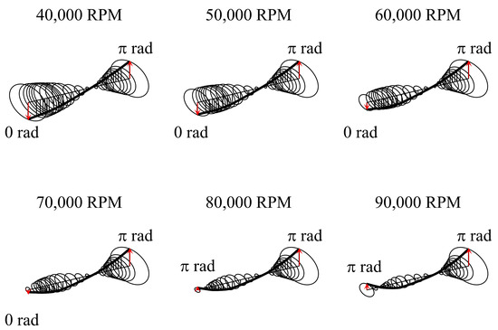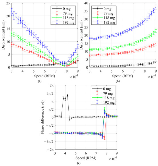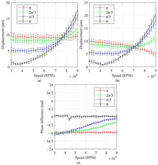As shown in Figure 13, the experimental results show that at high speeds (greater than 80,000 RPM), larger phase differences between the unbalanced masses resulted in smaller displacements. Conversely, at low speeds (less than 70,000 RPM), smaller phase differences led to smaller displacements. At a phase difference of 0, the displacement at around 40,000 RPM was close to 1 µm, which is a very small displacement for an unbalanced mass of 79 mg. These findings suggest that for the rotor structure of the HFCVACs, a rational distribution of the unbalanced mass phase can significantly reduce rotor displacement, even with a large unbalanced mass, at specific rotational speeds.