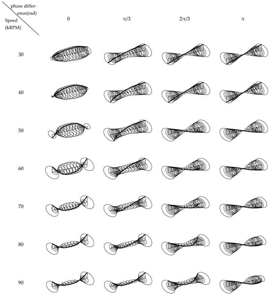 Figure 14 shows the variation of the ODSs of the rotor with 79 mg bilateral unbalanced mass installed. Like the unilateral unbalanced mass case, the rotor transitions from a rigid mode to a bending mode as the speed increases. However, the speed at which this transition occurs depends on the phase difference of the unbalanced mass distribution. For unbalanced masses with the same phase, the rotor displacement shifts from rigid to bending mode dominance at lower speeds. In contrast, when the unbalanced masses are in different phases, this transition occurs at a higher speed. A larger phase difference between the unbalanced masses increases the rotational speed required for the bending mode to become dominant. In-phase unbalanced masses stimulate the bending mode earlier because the rotor’s structure—primarily concentrated in the permanent magnet at the rotor’s center and the impellers at both ends—supports bending modes. The direction of the force generated by in-phase unbalanced masses aligns with that of the bending mode. As a result, in-phase unbalanced masses can more effectively use the rotor’s bending modes to counteract the displacement caused by rigid translational modes, leading to less vibration at lower speeds.