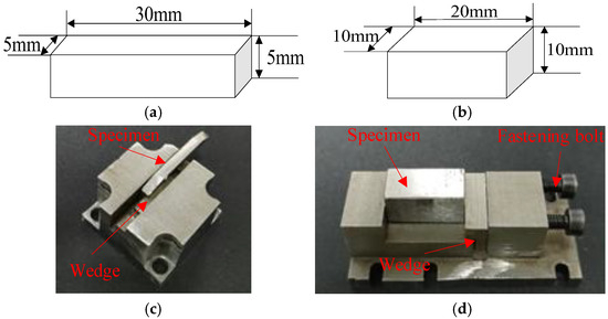 The specimen and its fixture: (a) upper specimen; (b) lower specimen; (c) upper specimen fixture; (d) lower specimen fixture.