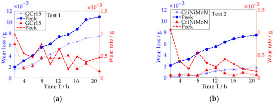 With the progress of the wear process, the wear amount of the shaft and bearing samples gradually increases, and the wear rate first gradually decreases and then stabilizes around a small value. In the initial wear stage, the wear amount of the wing rotating shaft and bearing specimens is small and the wear rate in the initial wear stage is relatively high. As the wear process progresses, the amount of wear gradually increases, and its surface morphology gradually becomes smooth. The friction pair reaches a stable state. Although the amount of wear continues to increase, the wear rate will decrease and stabilize around a smaller value. The wear rate around 0.5 × 10−3 g/h in the stable stage is less than the running-in stage for Test 1, and the wear rate of CrNiMoN is less than GCr15, which indicate that CrNiMoN has a better wear resistance. In addition, the experiment results can reduce the high cost and cycle of long-term offshore testing and improve the research and development efficiency of new materials and structures.
