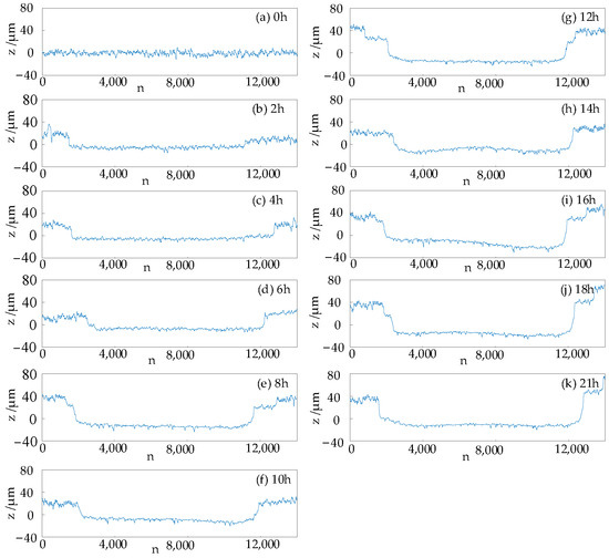 Due to the action of waves, the wave glider wing moves every 6 s or so, and the reciprocating motion of the shaft in the bearing is approximately between 20° and −90°, and the reciprocating stroke of sliding is 4.5 mm. The wing needs to move more than 1.5 million times in a 6-month maintenance cycle. Therefore, considering the working characteristics of the rotating shaft of the wave glider wing, the load is set to 20 N and the reciprocating stroke is 4.5 mm. In order to increase the efficiency of the test, a reinforced test design with a reciprocating frequency of 20 Hz was adopted, and the length of each test was set to 21 h based on a maintenance cycle. In order to collect information on the surface morphology and wear amount of the friction pair, an offline shutdown method was used to collect the contour curve of the worn surface morphology every 2 h, and a torque sensor was used to collect the friction force signal.