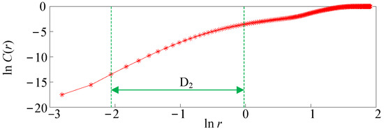 A curve under the double logarithmic coordinate lnC(r) − lnr can be obtained, and the slope of the fitting line is the correlation dimension D2. To use the test as an example, the result is shown in Figure 7.
