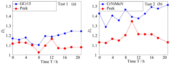 It can be seen that, as the wear process progresses, Ds of the GCr15 and CrNiMoN shaft specimens first increases and then stabilized near a large value. However, Ds of the Peek surface in Test 1 oscillates, while that of the Peek surface in Test 2 first increases and then decreases. Ds describes the complex geometric structure of worn surfaces. The higher its value, the higher the surface self-similarity and smoothness, which indicates that worn surfaces have an evolution law from roughness to smoothness. This also reflects the complexity and evolution process of worn surfaces. The larger Ds represents the smoothness and high self-similarity of the surface, indicating that the surface state is stable. Thus, CrNiMoN is more wear-resistant compared with GCr15 in the process.