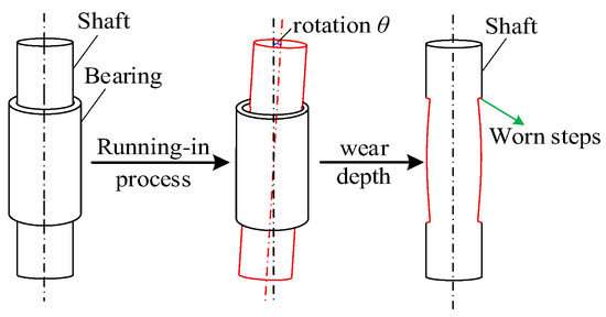 It can be seen from Figure 11 and Figure 12 that, in the initial running-in stage, the wear amount and inter axis clearance between the rotating shaft and the bearing are small, and small wear marks exist on the rotating shaft surface. The created friction force is also small and significantly fluctuates, and the friction pair surface is rough. The actual contact area and the number of contact points are small, while the area of most of the contact points is large. The adhesion of contact points is severe. Therefore, the wear rate is large, the surface fractal dimension, correlation dimension and phase-point saturation significantly change, and the range of phase trajectory movement is large. The wear process is unstable and the system diverges at this time. In addition, as the wear process progresses, although the wear amount of the bearing gradually increases, and even small wear steps may appear, the traces on the wear surface of the rotating shaft gradually stabilize. This results in forming a stable worn surface with the coupling effect of corrosion and abrasive wear; the wear mechanism of the rotation shaft and bearing pairs are shown in Figure 13.