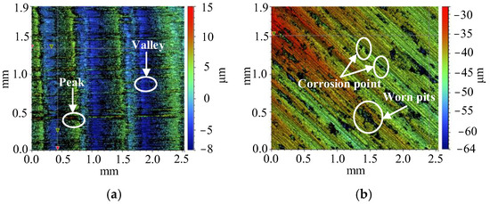 During the wear process, the wear degree of the rotating shaft and bearings constantly changes under the coupling impact of axial force, radial force, friction force, vibration impact force, and corrosion, which contributes to the unbalanced 2D worn surface morphology shown in Figure 12.