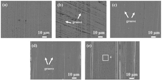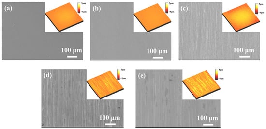 The surface morphology of the GCr15 steel with different Sa: (a) 0.01 μm, (b) 0.1 μm, (c) 0.5 μm, (d) 1 μm, and (e) 1.5 μm.