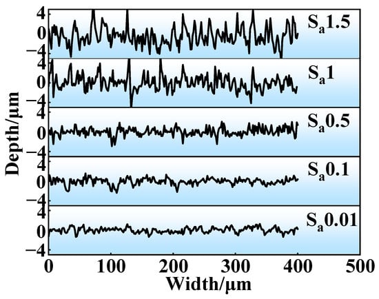 Figure 2 presents the surface morphology of GCr15 steel, highlighting variations in both surface elevation and asperity configuration. The roughness parameter, Sa, was determined by averaging measurements taken at five distinct positions, as detailed in Table 3. In Figure 2, surfaces exhibiting Sa values of 0.01 μm and 0.1 μm reveal no discernible scratches, resulting in notably even surfaces. When Sa increases to 0.5 μm, 1 μm, and 1.5 μm, the sample surfaces display a uniform distribution of peaks and valleys accompanied by only minimal scratch marks. Moreover, Figure 3 illustrates the surface profile curves of GCr15 steel under various Sa conditions. It is evident that a Sa of 0.01 μm yields the least variation in surface elevation, with the peak-to-valley distance reaching its maximum value (Rz, as shown in Figure 1) of 2.39 μm. As Sa rises to 0.1 μm and 0.5 μm, Rz correspondingly attains 3.62 μm and 4.91 μm. When Sa reaches 1 μm, Rz escalates to 6.51 μm, and a further increase to 1.5 μm results in the most pronounced surface height variation with an Rz of 8.25 μm. Figure 3 further confirms that with increasing Sa, the Rz grows, implying a reduction in the density of asperities per unit length.