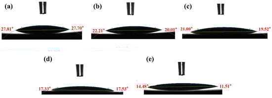 Contact angle of GCr15 steel with different Sa: (a) 0.01 μm, (b) 0.1 μm, (c) 0.5 μm, (d) 1 μm, and (e) 1.5 μm.