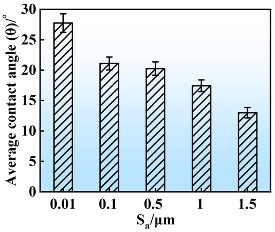 The wettability characteristics of GCr15 steel are depicted in Figure 4, with Figure 5 quantifying the average contact angle (θ) variations across specimens exhibiting distinct Sa parameters. Progressive elevation of Sa correlates with a systematic reduction in wetting angles for GCr15 steel. Experimental data demonstrate a significant θ decline from 27.75° to 13° as Sa increases within the 0.01–1.5 μm range. Surface wettability evaluation fundamentally relies on liquid-substrate contact angle analysis, where θ magnitudes are governed by a interfacial energy equilibrium between solid and liquid phases. Crucially, solid surface topography and three-phase interfacial interactions substantially modulate wetting behavior through their impact on contact line dynamics. A smoother and flatter surface results in an increased contact angle. The contact angle, which characterizes the wetting properties of the solid/liquid interface, affects the oil film thickness. Furthermore, the adhesion force required for lubricant molecules to form an adsorbed film on the friction surface is directly related to the surface wettability. A smaller contact angle signifies a higher adhesion force at the solid/liquid interface, which improves the liquid’s film-forming ability on the solid surface and leads to an increase in the minimum oil film thickness.
