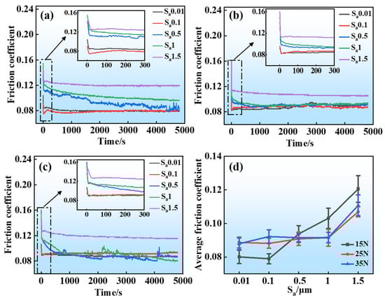 Friction coefficient of GCr15 steel with different Sa at different loads under oil lubrication: (a) 15 N, (b) 25 N, (c) 35 N, and (d) average friction coefficient.