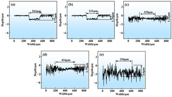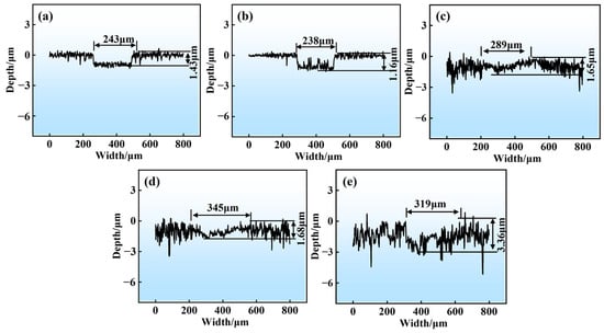 Cross-sectional profiles of GCr15 steel with different Sa under the load of 35 N: (a) 0.01 μm, (b) 0.1 μm, (c) 0.5 μm, (d) 1 μm, and (e) 1.5 μm.