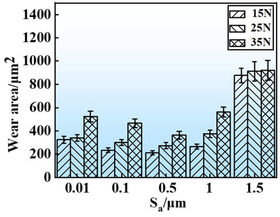 Figure 10 presents the wear area of GCr15 steel under a variety of loading conditions. The area was calculated by integrating the wear tracks depicted in Figure 7, Figure 8 and Figure 9. It is evident that increasing the applied load results in a steady expansion of the wear area, reflecting a more pronounced wear process. Moreover, the influence of the initial surface finish exhibits a non-monotonic trend, whereby the wear area initially diminishes and then enlarges with further increases in roughness. Under a 15 N load, the specimen with a Sa value of 0.5 μm has the smallest wear area at 763 μm2, while that with a Sa value of 1.5 μm reaches the highest value of 1590 μm2. At a 25 N load, the minimum area, 273 μm2, is observed for the sample with a Sa of 0.1 μm, whereas the one with a Sa of 1.5 μm exhibits a wear area of 912 μm2. When the load is raised to 35 N, the specimen with a Sa of 0.5 μm shows a wear area of 362 μm2, and that with a Sa of 1.5 μm increases to 921 μm2.