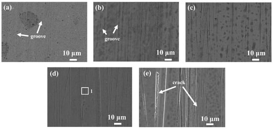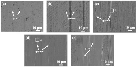 Figure 11, Figure 12 and Figure 13 illustrate the surface damage characteristics of GCr15 steel under various loading conditions. In Figure 11, when a 15 N load is applied, specimens with Sa values of 0.01 μm and 0.1 μm display distinct furrow patterns accompanied by minor adhesion-induced pits, indicating that both abrasive and adhesive mechanisms govern the wear process. In contrast, for specimens with Sa values of 0.5 μm, 1 μm, and 1.5 μm, the micro-asperities reveal different extents of deterioration, with the specimen having a Sa of 1.5 μm suffering from notably severe surface damage. Figure 12 presents the wear patterns under a 25 N load, where specimens with Sa values of 0.01 μm and 0.1 μm exhibit pronounced furrow-like features, along with adhesion-related pits, suggesting that abrasion and adhesion remain the dominant damage processes. For the specimen with a Sa of 1 μm, the surface asperities are entirely worn away, leading to the formation of pits, while the specimen with a Sa of 0.5 μm retains some asperities that are only partially worn. Owing to a larger Rz, the micro-asperities on the specimen with a Sa of 1.5 μm erode at a slower rate, preventing complete flattening. In Figure 13, under a 35 N load, specimens with Sa values of 0.01 μm and 0.1 μm feature a multitude of broad furrows along with minor adhesive pits, with abrasion serving as the chief wear mechanism. Additionally, for specimens with Sa values of 0.5 μm, 1 μm, and 1.5 μm, most of the surface asperities have been worn off, resulting in relatively smooth surfaces.