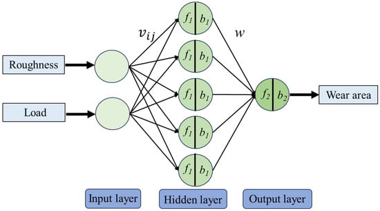 Post-normalization, the normalized roughness Sanorm and normalized load Fnorm are assigned as the input layer III (Equation (2)), whereas the normalized wear area Wnorm serves as the output layer O (Equation (3)). The hidden layer H (Equation (4)) contains five neurons.