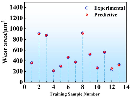 To evaluate the accuracy of the established model, a series of wear area measurements for GCr15 steel were obtained by inputting various Sa and load conditions into the model, as illustrated in Figure 15. From the prediction results of the training set in Figure 15, it can be seen that the model has a very high degree of fitting to the training set data, which strongly proves the excellent training performance of the model [32]. The predictive capability of the model was further assessed by using input values of Sa = 0.01 μm and F = 25 N, as well as Sa = 0.5 μm and F = 25 N, which yielded predicted wear areas of 365.51 μm² and 234.48 μm2, respectively. Under identical experimental conditions, the measured wear areas were 341 μm2 and 273 μm2, corresponding to prediction errors of 7.19% and 14.1% (Table 6), and resulting in an average relative error of 10.64%. The error analysis indicates that the BP neural network is capable of predicting the wear area of materials under varying conditions (i.e., different loads and Sa values), thereby providing an efficient and low-cost approach for forecasting the wear performance of bearings in industrial applications.