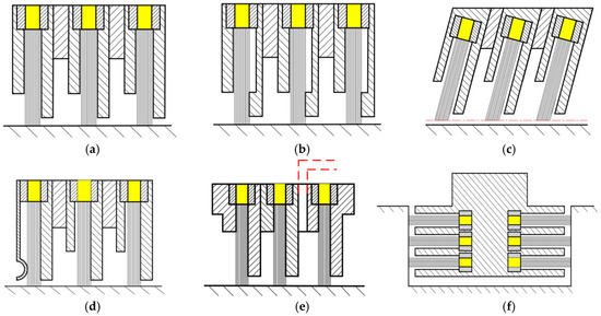 Many researchers have proposed a variety of brush seal structures for different problems such as bristle disturbance and high downstream temperature, as shown in Figure 1. The series combination of traditional and low hysteresis single-stage brush seal was a commonly used multi-stage brush seal structure [8], as shown in Figure 1a,b. In order to further improve the sealing performance of the multi-stage brush seal, Addis et al. [9] proposed a multi-stage brush seal structure with an axial tilt, as shown in Figure 1c. The bristle pack of this structure tilted to the high-pressure side, and because of the action of air force, the bristle pack produced closure effect and axial deformation, which can reduce radial clearance to improve the sealing performance. Aiming at the problem that the front row bristles were susceptible to fatigue fracture caused by unstable air disturbance during operation, Tseng et al. [10] proposed a multi-stage brush seal structure with first-stage vibration-suppression elastic piece, as shown in Figure 1d. The vibration-suppression elastic piece could protect the front bristles and prolong the service life of the brush seal. Tanimura [11] proposed a multi-stage brush seal structure with inter-stage exhaust channel to solve the problem of high temperature of the final stage bristles, as shown in Figure 1e. This structure set an air leakage channel between the adjacent last two-stages, which was used to take away the high temperature air, reduce the temperature of the last stage bristle pack and prevent bristles from fusing due to the high temperature. Aiming at the problem of friction and wear of bristles caused by the radial runout of the rotor, Naert et al. [12]. proposed a multi-stage brush seal structure with radial arrangement of bristles, as shown in Figure 1f. This structure could alleviate the friction and wear of the bristles caused by the radial runout of the rotor. In addition, this structure was compact and light-weight.