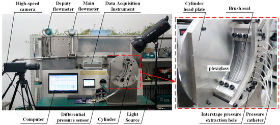 In order to be able to check whether the model reflects reality accurately, an experimental device for the leakage flow characteristics and pressure drop distribution characteristics of the brush seal was designed and built, as shown in Figure 7. The test bench adopted a one-sided inlet and one-sided outlet. The pressure was provided by the air compressor, and the maximum available pressure was 1 MPa. The gas was compressed by the air compressor and entered the cold dryer for drying treatment, then flowed into the flow path. This verification took the three-stage brush seal structure as the research object, and compared the results obtained by the experiment with the calculation results of the three-dimensional solid method in this paper to verify the accuracy of the numerical method. The experimental principle diagram of pressure drop distribution characteristics of the brush seal is shown in Figure 8. There were two inlet pressure measuring points at the upper and lower entrances of each single-stage brush seal unit. The two pressure measuring points at the upper and lower levels of each stage were one group, and there were four groups in total. At the outlet end, there were four groups of outlet pressure measuring points corresponding to the inlet pressure measuring points. In the pressure drop measuring device, the gas flowed from the inlet pressure measuring points and flowed out of the corresponding outlet pressure measuring points at the end of the base through the bristle pack, and further led the gas into the differential pressure sensor by the flexible ducts, which was used to measure the inter-stage pressure drop of the multi-stage brush seal. The differential pressure sensor was connected with the data acquisition instrument, and the data of each pressure measuring point were collected on the computer. The average value of the data of two pressure measuring points in each group was taken as the inter-stage pressure at this position. The difference between the upstream and downstream inter-stage pressures of a brush seal was the pressure drop between the brush seal stages. A photo of the brush seal test piece is shown in Figure 9, in which the axial sealing ring is used to reduce the leakage path, and the sealing slide is used to fix and replace the brush seal.